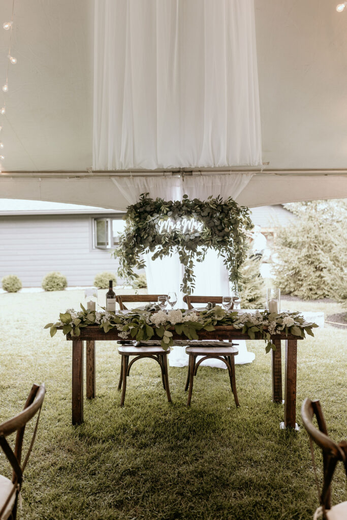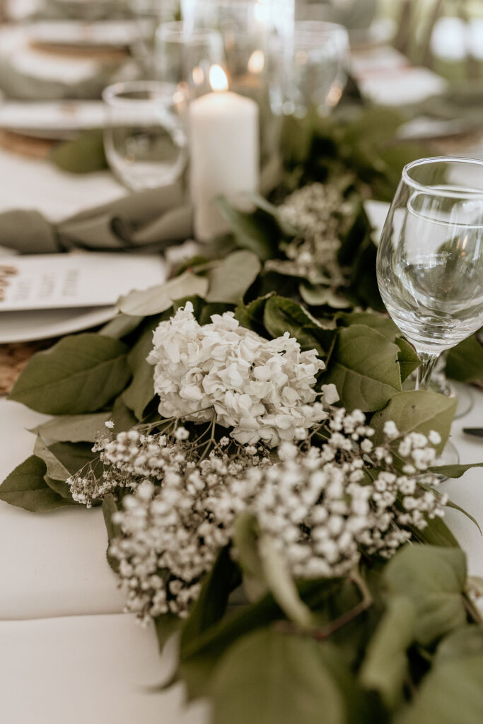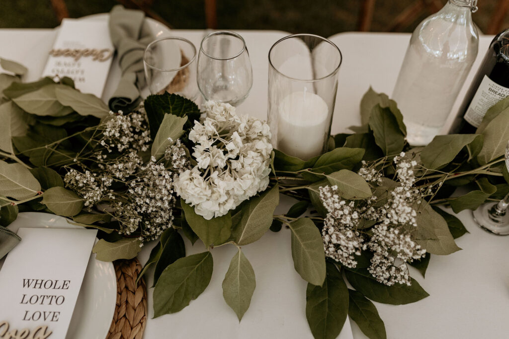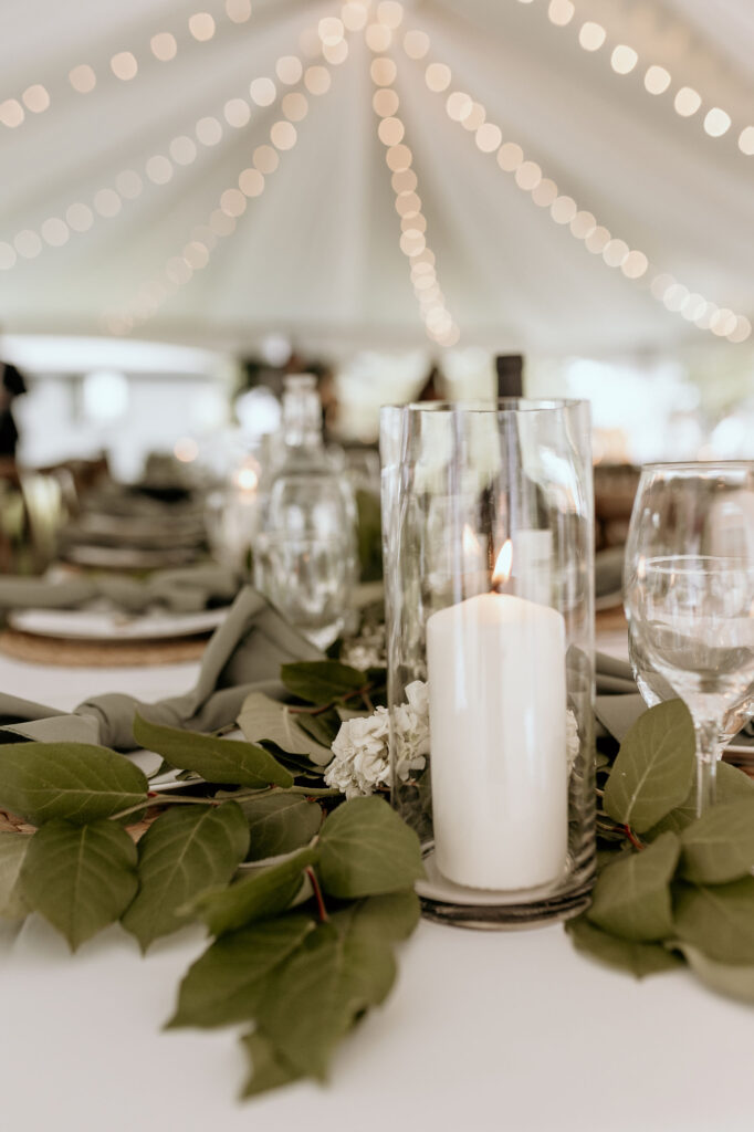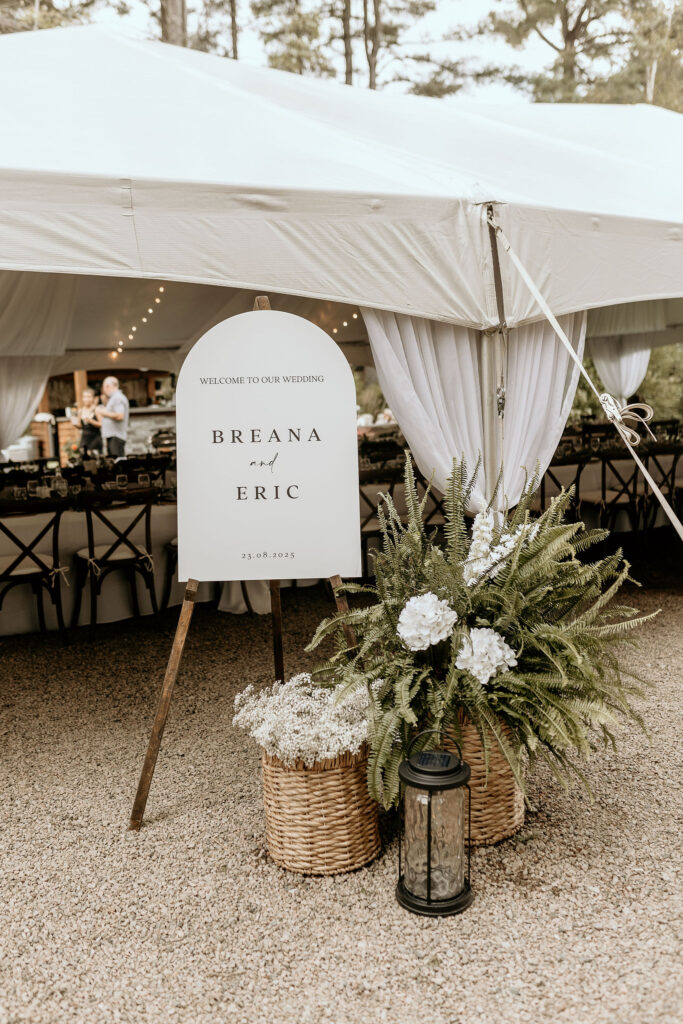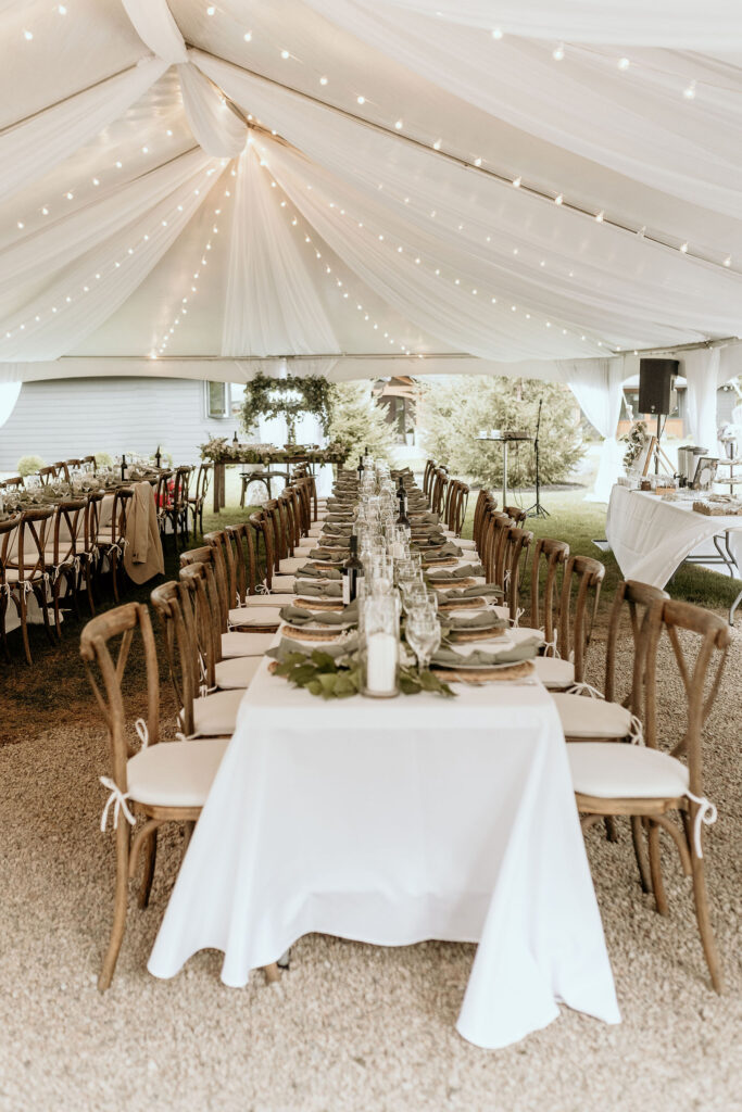 30’x50′ White Frame Tent, 7ft Side Pole Cover, Two Station Luxury Restroom Trailer, Sheer Draping and White String Globe Lighting, Wood Cross Back Chair, 8ft Banquet Table, 6ft Banquet Table, 6ft Harvest Table Dark Wood, White Linens, Eucalyptus Napkins, Rattan charger, Cylinder Vase, Porcelain Dinnerware, Silver Cutlery, 12oz Wine Glass, Water Goblet.
