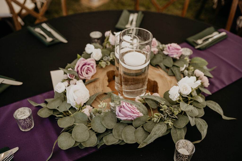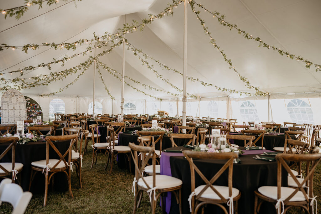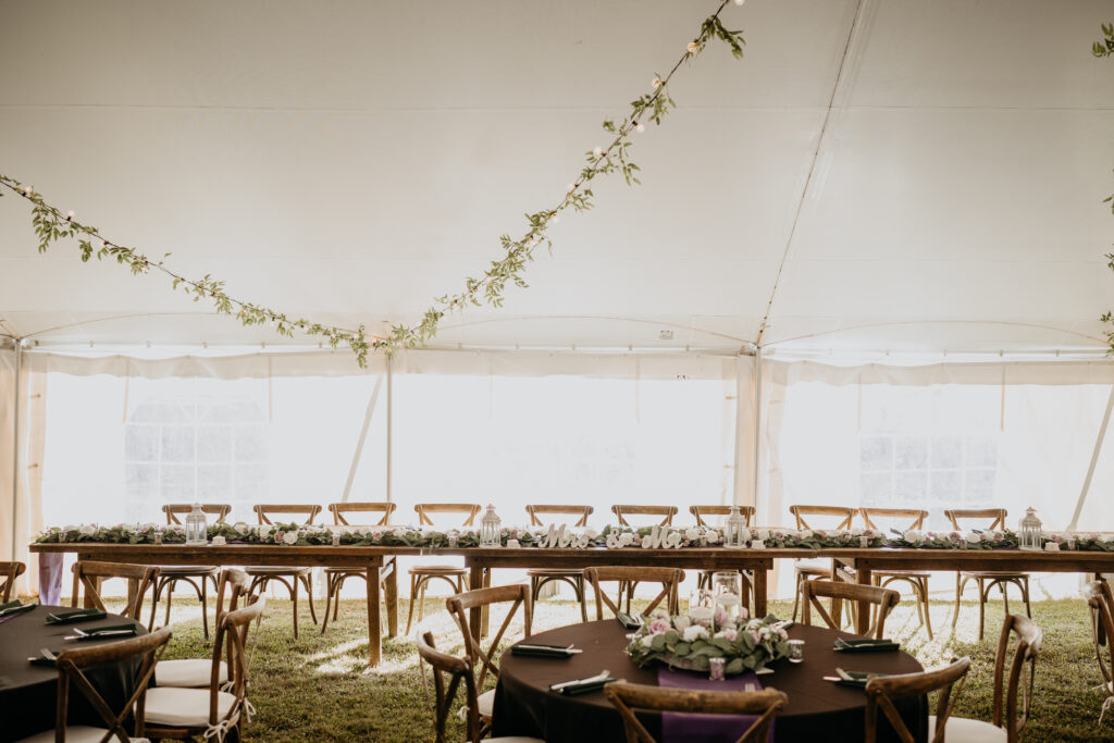 40’x100′ White High Peak Pole Tent, Silk Greenery Attached to Globe Lighting, 20’x20′ Plywood Dancefloor, Forest Collection Wood Bar, Wood Cross Back Chair, 8ft Harvest Table Dark Wood, 5ft Round Table, 6ft Round Table, 42″ High Bar/Cruiser Table, White Polyester Linens, Forest Napkins, Purple Table Runners, Porcelain Dinnerware, Silver Cutlery, Gabriella Collection Wreath, Gabriella Collection Garlands, Mercury Silver Tea Light Votives.