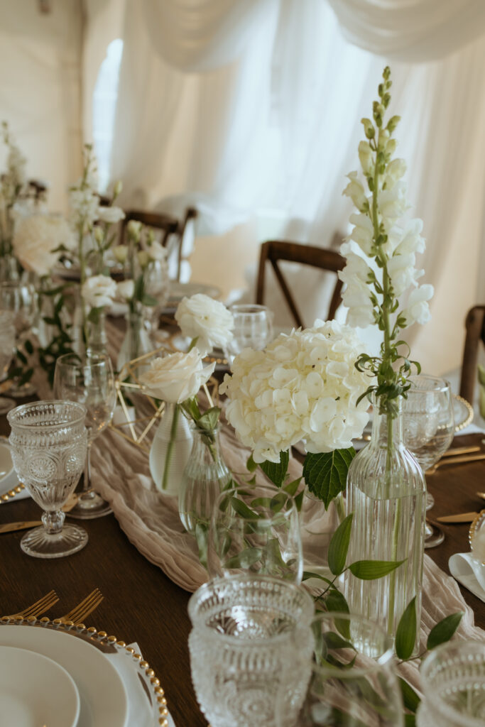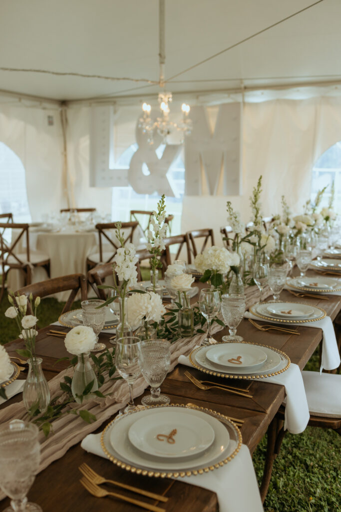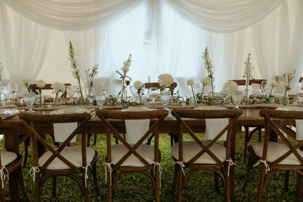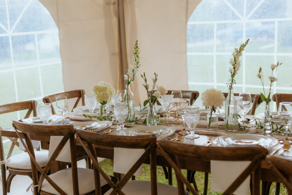 20’x30′ White Cross Cable Tent, 8ft Harvest Table Dark Wood, Wood Cross Back Chair, 5ft Round Table, 42″ High Bar/Cruiser Table, Dark Stain Post & Beam Arbour, Forest Collection Wood Easel, White Polyester Linens, Acrylic Chandelier, Taupe Gauze Runner, Glass Gold Beaded Charger Plate, Gold Cutlery, Clear Vintage Water Goblet, 12oz Wine Glass, Porcelain Dinnerware.