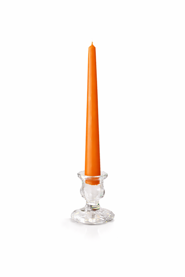 These 10″ bright orange taper candles pair beautifully with crisp white or ivory linens and complement natural wood, lush greenery, seasonal florals, and gold or brass accents. Perfect for fall weddings, festive celebrations, and bold modern events, they create a warm, glowing ambiance that enhances both daytime and candlelit settings.