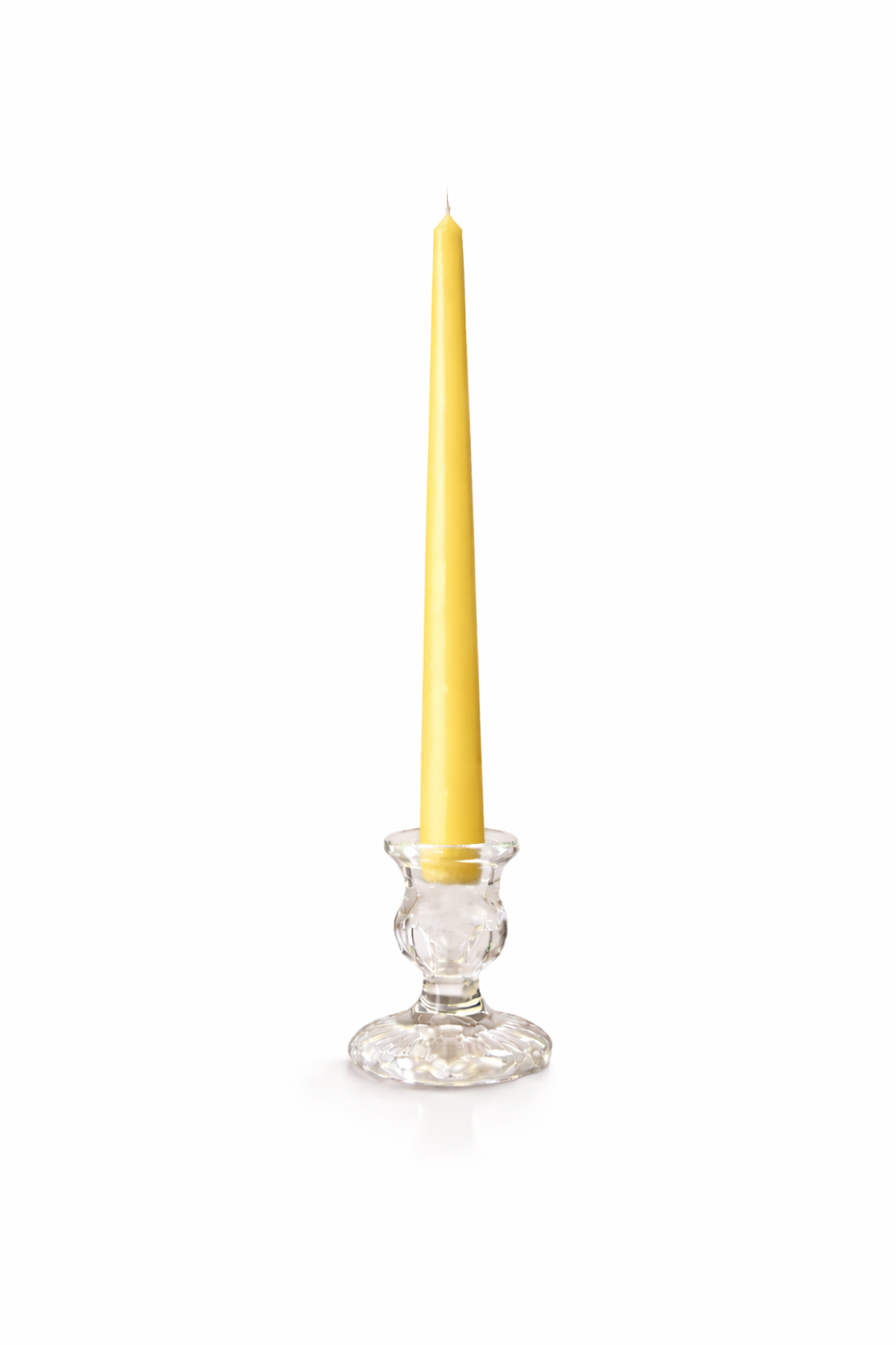 These 10″ buttercup yellow taper candles pair beautifully with crisp white or ivory linens and complement natural wood, soft greenery, pastel florals, and gold or brass accents. Perfect for spring and summer weddings, garden celebrations, baby showers, and romantic outdoor events, they create a warm, radiant glow that enhances both daytime and evening settings.