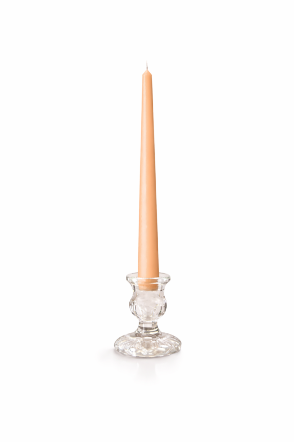 These 10″ peach taper candles pair beautifully with crisp white or ivory linens and complement natural wood, soft greenery, blush florals, and gold or brass accents. Perfect for spring and summer weddings, garden celebrations, and romantic modern events. They create a warm, glowing ambiance that enhances both daytime and evening settings.