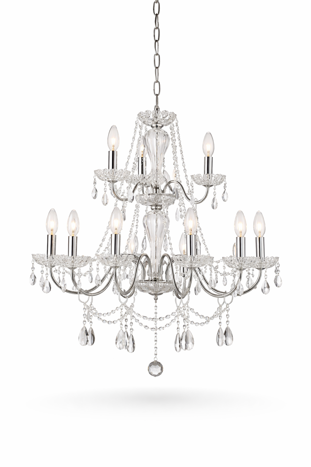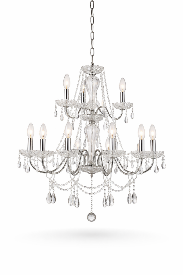 The chandelier features a stunning acrylic crystal design that reflects and refracts light, creating a dazzling display that adds depth and dimension to your event space.