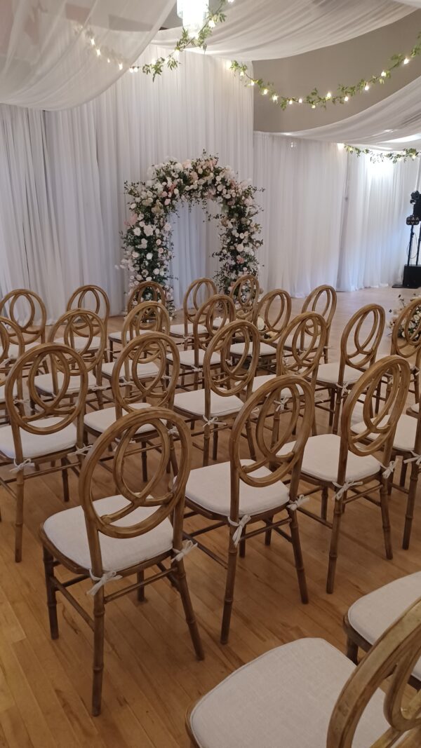 Make your event unforgettable with the addition of our Antique Natural Wood Infinity Chairs. Contact Valley Tent & Party Rentals Ltd today to elevate your seating arrangements to new heights of elegance and sophistication.