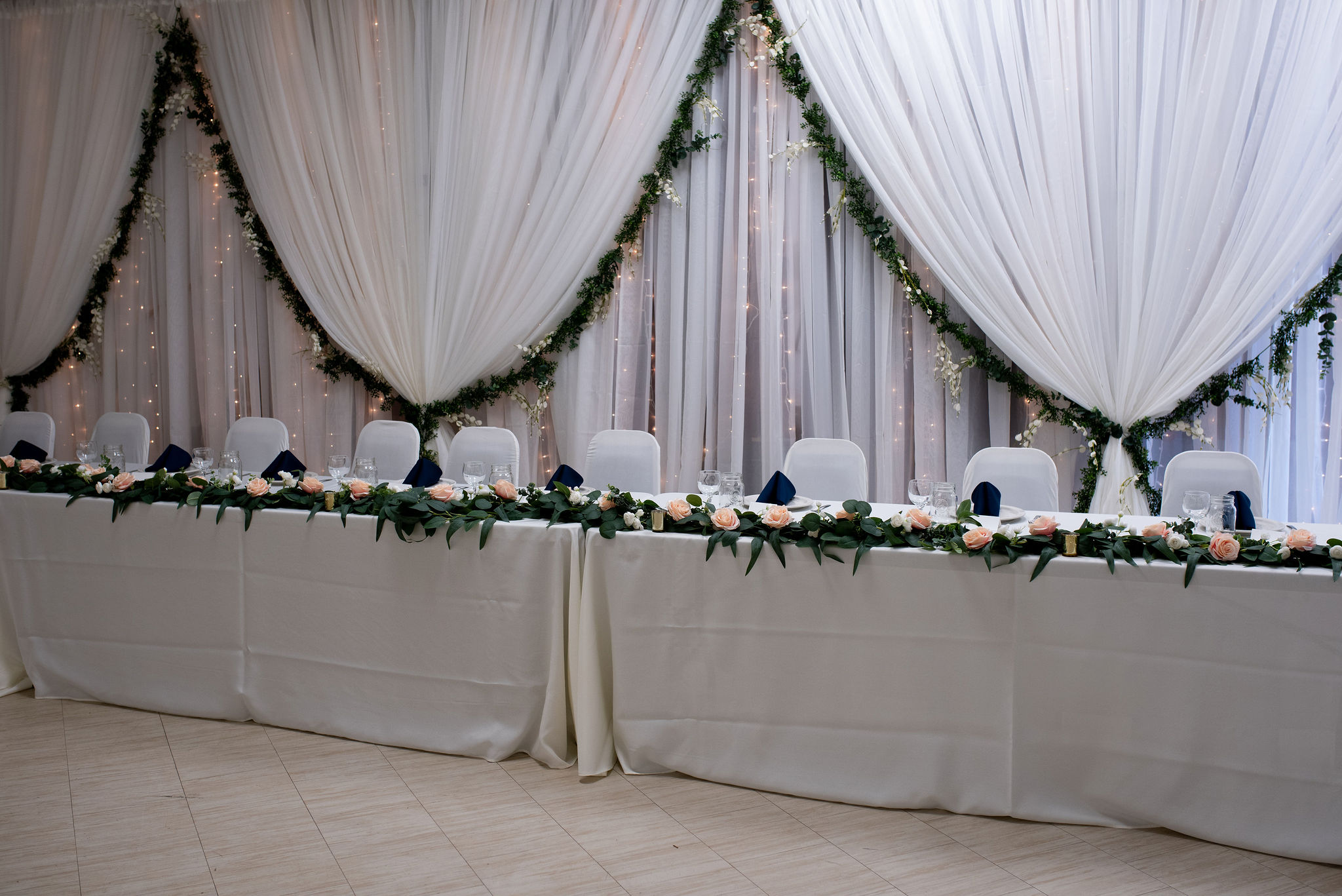 Add your choice of lighting from our available options – chandeliers, mini string lights, LED uplighting – to enhance the beauty of the backdrop, creating a soft and romantic glow that adds warmth and ambiance to your wedding venue.