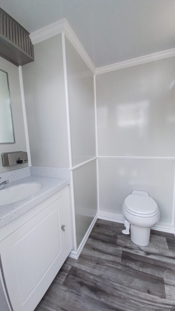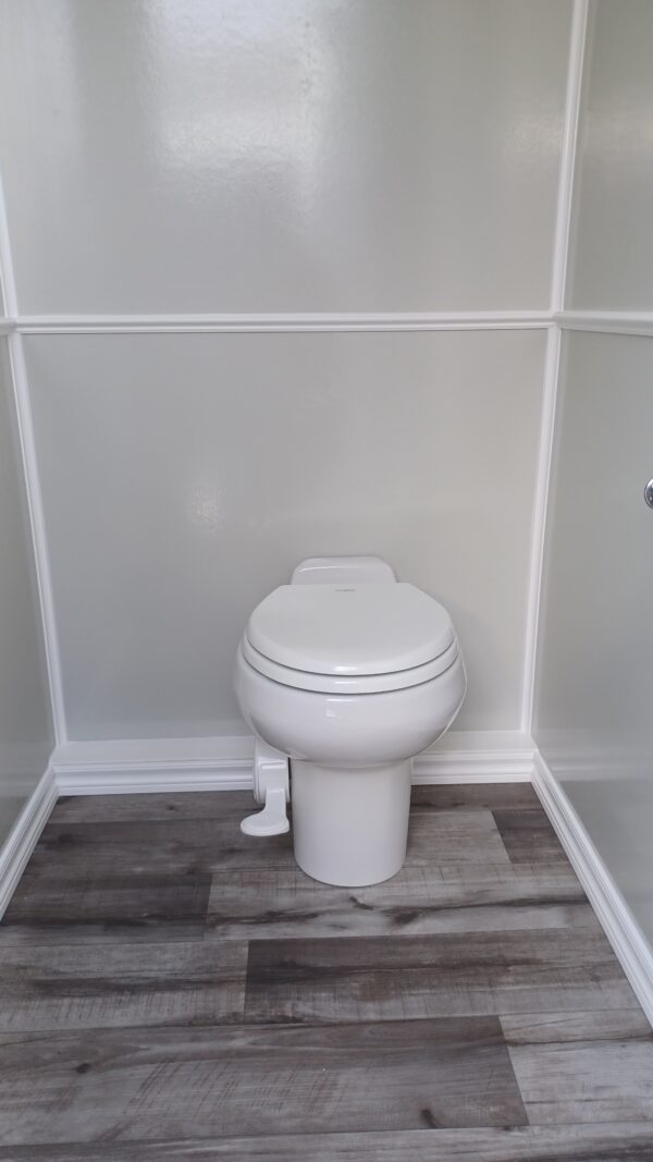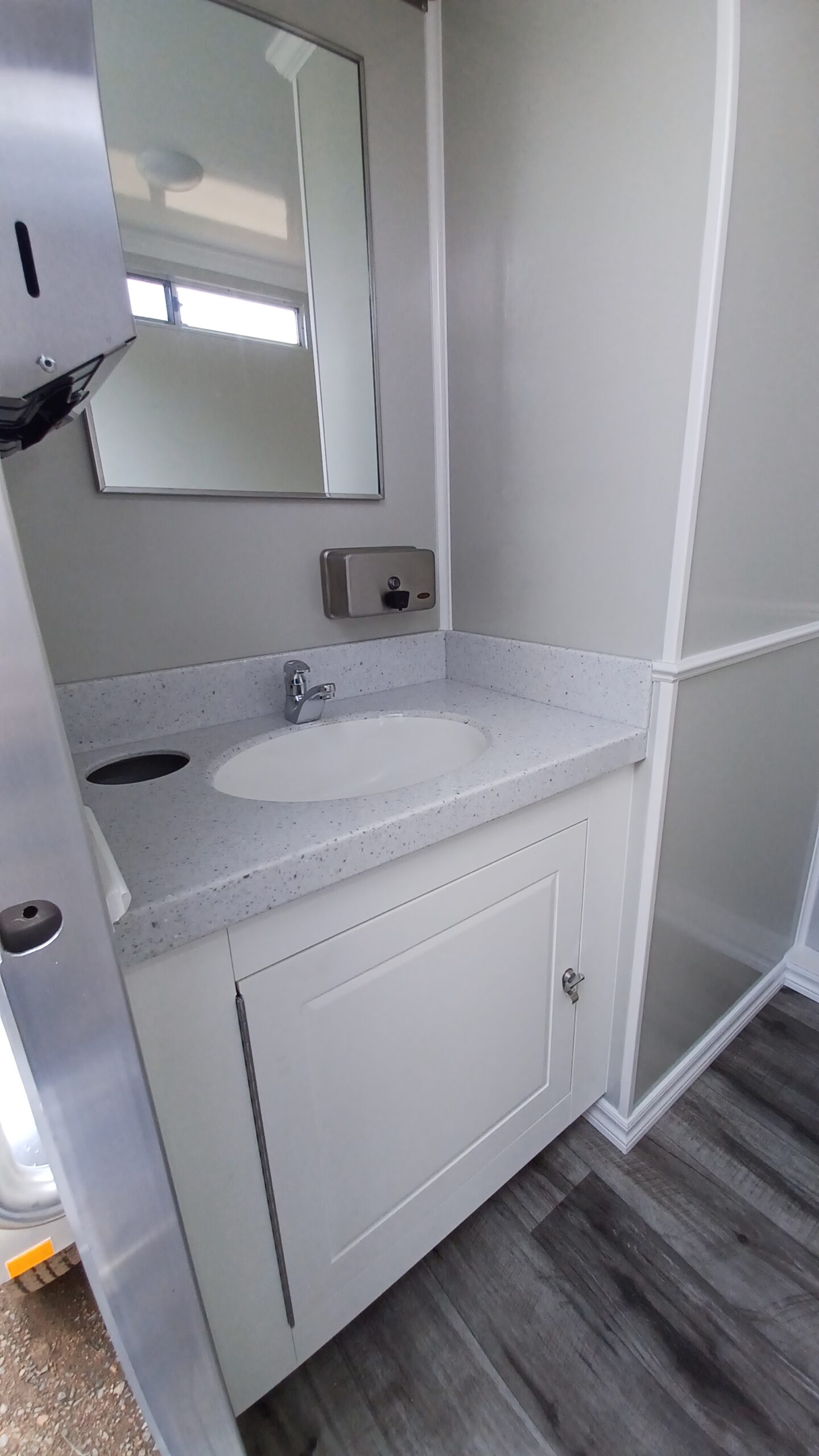 Step into a world of refinement as you enter our meticulously crafted restroom trailer. The air-conditioned environment ensures a comfortable experience, while the vinyl wood grain floors add a touch of elegance underfoot. Every detail has been carefully considered, from the modern faucets to the exquisite finishes, creating a restroom experience that exceeds expectations.