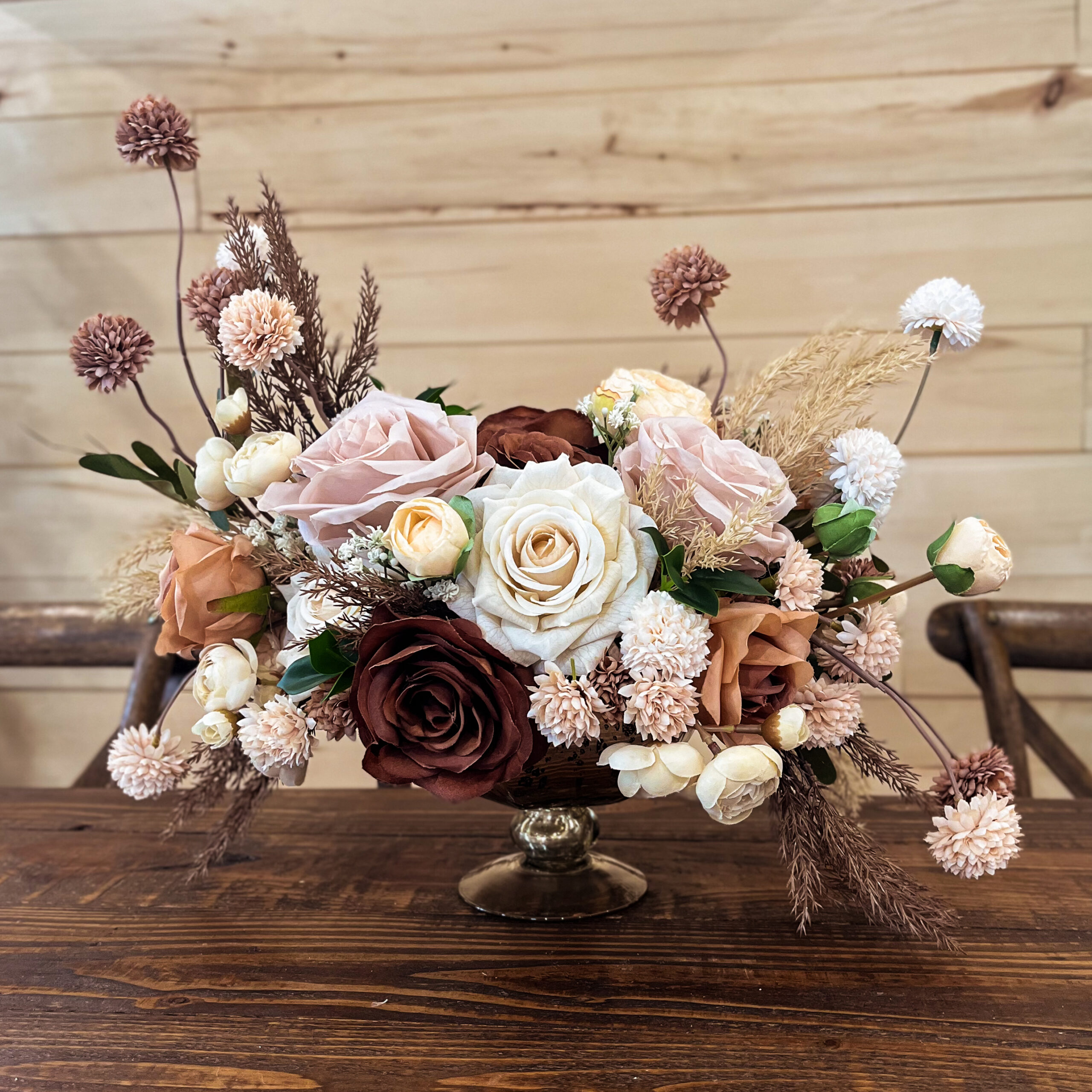Introducing the Maeve Petite Silk Floral Arrangement — a beautifully styled centerpiece designed to bring warmth, texture, and soft rustic charm to your wedding or special event. Featuring rich browns, muted pinks, and soft beige tones, Maeve captures the cozy essence of fall while maintaining an elevated and refined look. Available exclusively for hassle-free rental at Valley Tent & Party Rentals Ltd, this petite arrangement is thoughtfully crafted to complement rustic venues, tented receptions, barn weddings, and romantic autumn celebrations.