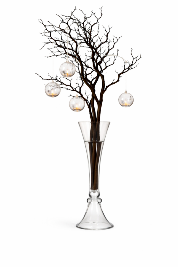 This set includes 1 trumpet vase, 3 brown manzanita branches, and 7 hanging tea light holders.