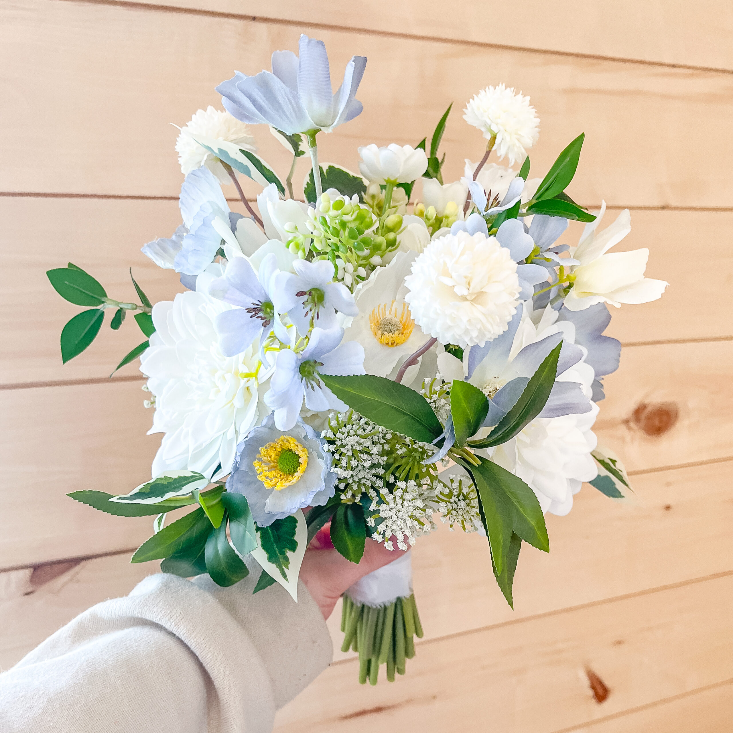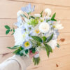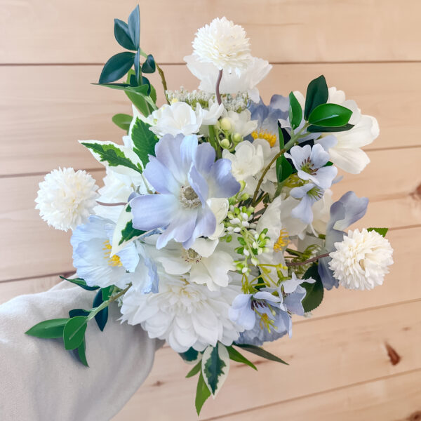 Perfectly coordinated with the Olivia Bridal Bouquet. The Olivia Silk Floral Bridesmaid Bouquet is a smaller arrangement that blends delicate blue and white silk florals with soft greenery. An ideal choice to tie your wedding party together with beauty and ease.