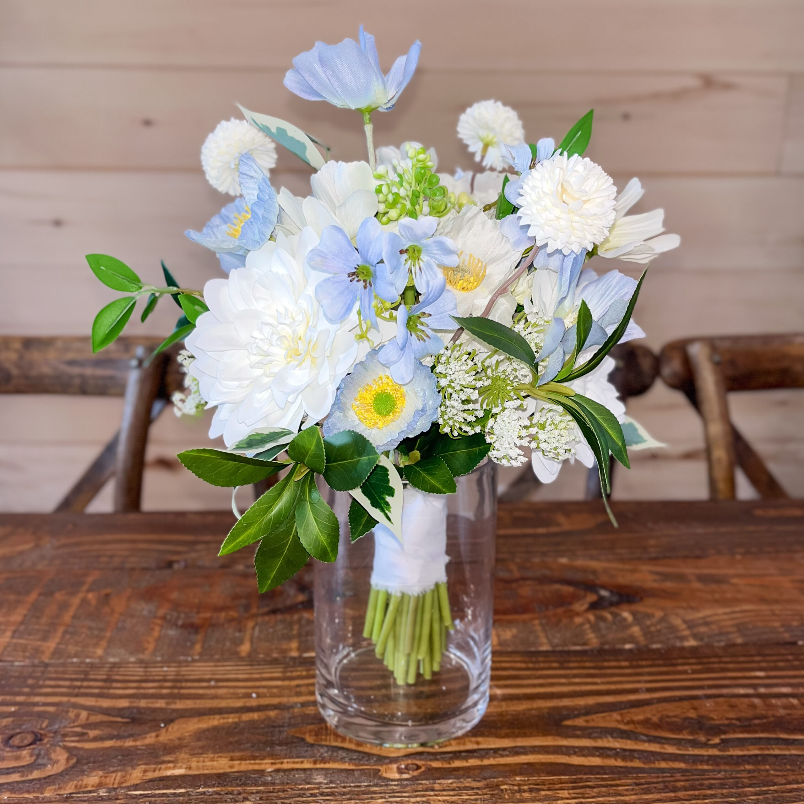 The inclusion of soft blue flowers lends a sense of serenity and sophistication, making it an ideal choice for weddings seeking a tranquil color palette.