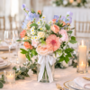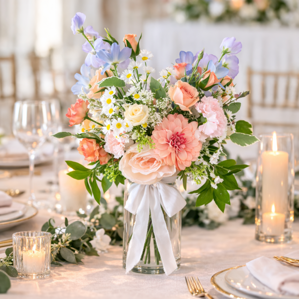 A harmonious blend of blush, peach, soft blue, and creamy neutral tones creates a romantic, garden-inspired look. The multicoloured palette adds depth and warmth while remaining timeless and effortlessly elegant.