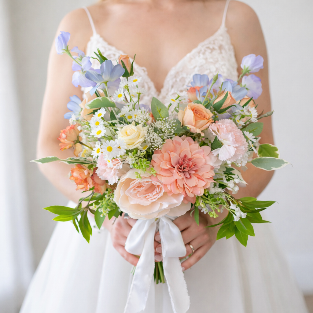 The Rosabella Silk Floral Bridal Bouquet features a romantic blend of multicoloured silk florals, thoughtfully arranged for a soft, garden-inspired look. Perfect for the bride who loves subtle colour and natural texture, this bouquet adds warmth and dimension while complementing a wide range of wedding themes and photographing beautifully.