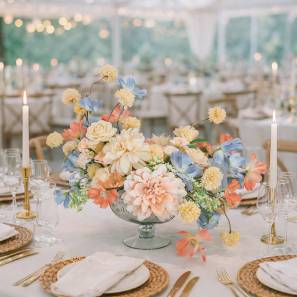 Introducing the Shannon Silk Floral Arrangement — a beautifully balanced centerpiece designed to elevate your wedding decor with soft peach, coral, pink, buttery yellow, and delicate blue tones. Available exclusively for hassle-free rental at Valley Tent & Party Rentals Ltd, this arrangement is thoughtfully crafted to bring warmth, romance, and refined elegance to your celebration.