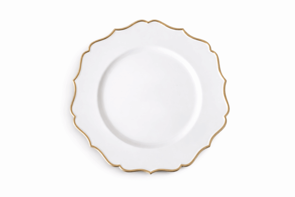 Crafted with meticulous attention to detail, our charger plates feature a sleek white acrylic base adorned with a stunning gold rim, creating a timeless and opulent look that captivates the eye. The unique shape of the plates adds a modern twist to traditional table settings.